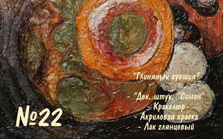 Работа №22. Автор: художник Тарас Шевченко, г. Ростов-на-Дону. «Глиняный кувшин» — выполнена декоративной штукатуркой «Саман», акриловой краской с применением грунтовки «Кракелюр» и глянцевого лака.