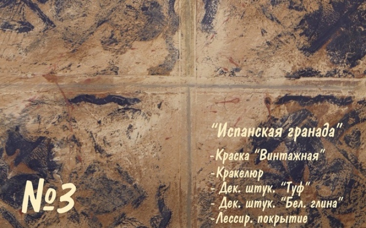 Работа №3. Автор: Александр Безух, салон декоративных штукатурок «Краски Бриз», г. Ростов-на-Дону. «Испанская гранада» — выполнена с применением «Винтажной краски», грунтовки «Кракелюр», декоративной штукатурки «Туф», декоративной штукатурки «Белая глина» и лессирующего покрытия.