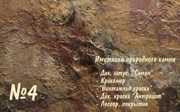 Работа №4. Автор: Александр Безух, салон декоративных штукатурок «Краски Бриз», г. Ростов-на-Дону. «Имитация природного камня» — выполнена с применением декоративной штукатурки «Саман», грунтовки «Кракелюр», «Винтажной» краски, декоративной краски «Антрацит» и лессирующего покрытия.