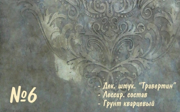 Работа №12. Автор: Олег Ситковский, салон «Краски Бриз», г. Ростов-на-Дону. Выполнена декоративной штукатуркой «Травертин» с применением трафарета и системы коррозии «Каталана».