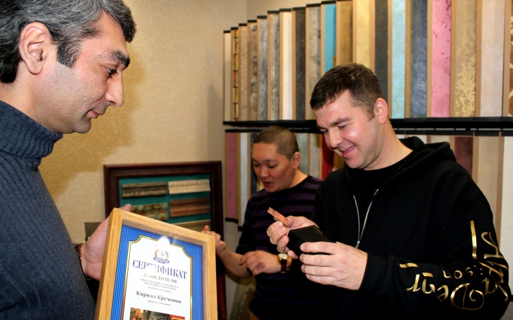 Рады сообщить, что 19 февраля в салоне №2 на ул. Мечникова, 134 состоялось награждение победителя нашего конкурса «Золотая кельма» «Краски Бриз», Кирилла Крученюк, который приехал к нам, чтобы стать полноправным владельцем заслуженной награды — золотой кельмы! Директор компании, Владимир Кармиркодиян, также вручил сертификат победителя и вся наша команда уже могла поздравить Кирилла с его достижением!