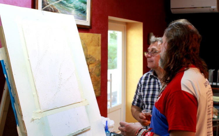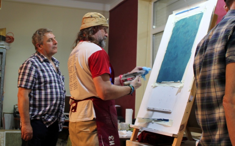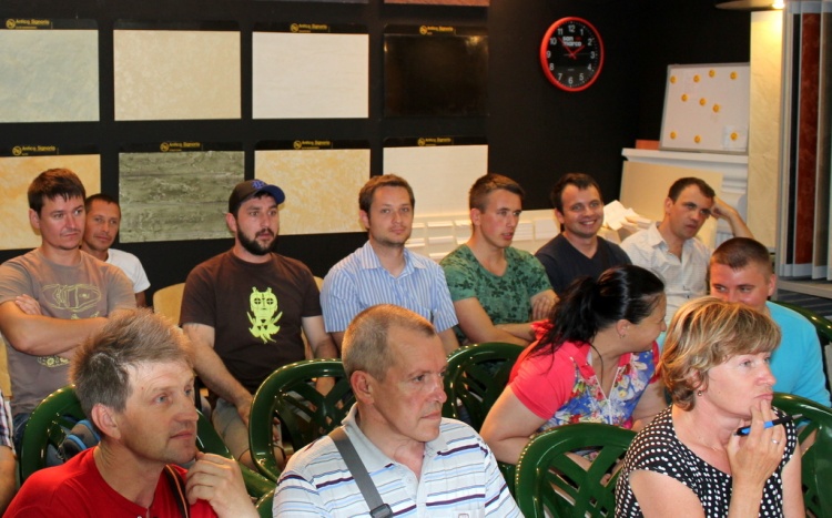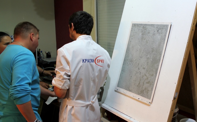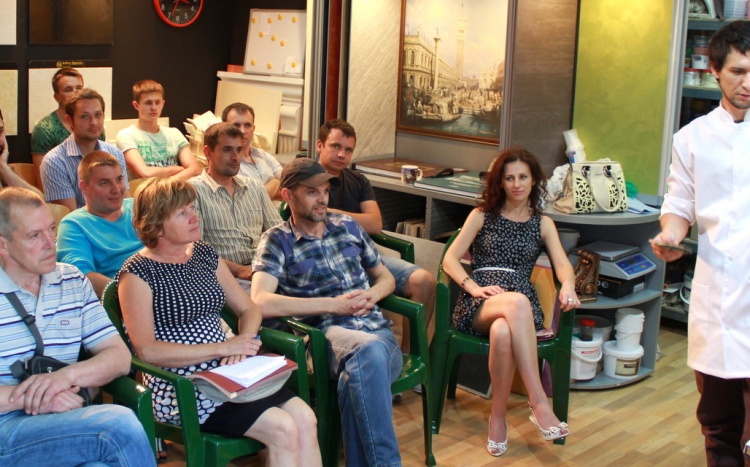Затем выступил Александр Безух, технолог-декоратор, и рассказал о новинке и хите – краске «Винтажной», сделав пробный образец для публики, подробно рассказал о работе с ней; поработал с «Травертином», имитируя бетон, а также все участники смогли увидеть и другие работы наших мастеров, запланированных в программе: декоративной краской «Жевуаль», «Органза», «Замша», декоративными штукатурками «Мелкий камень» и «Венецианка».