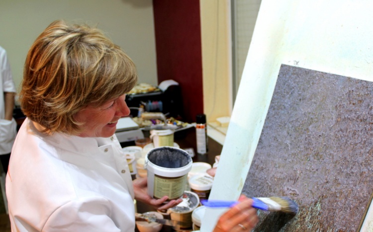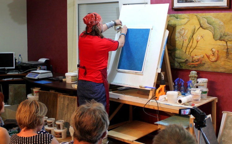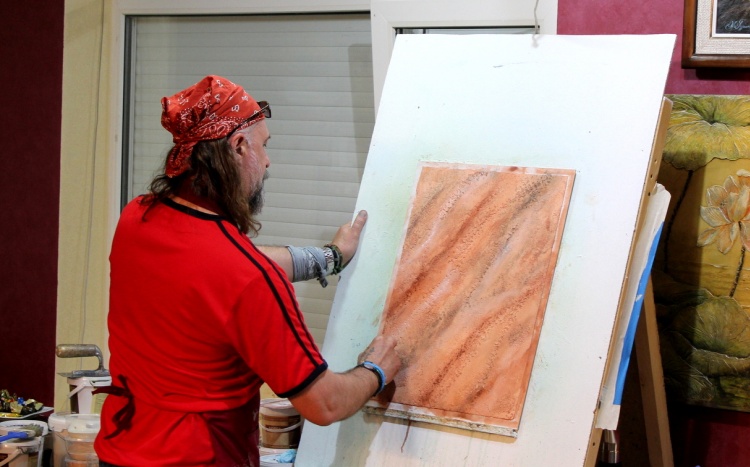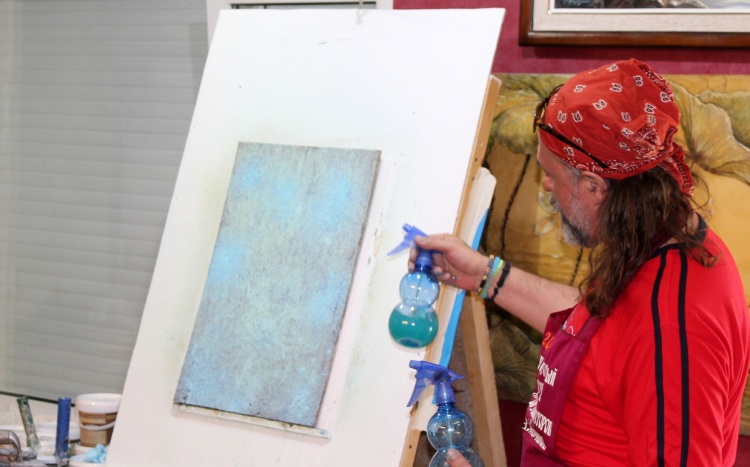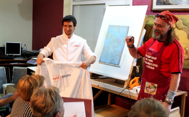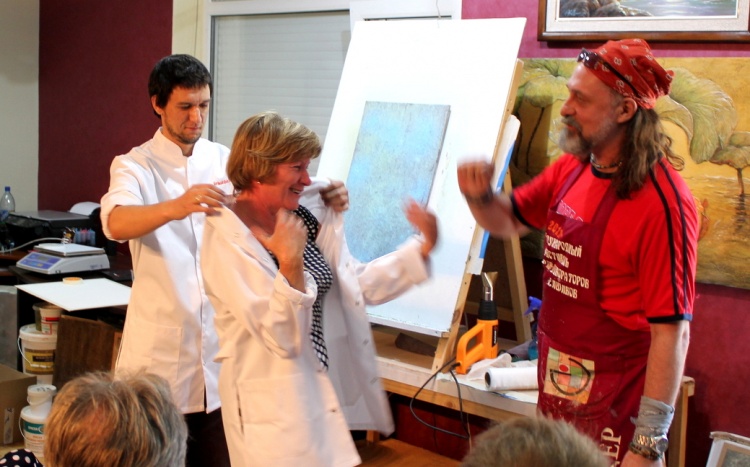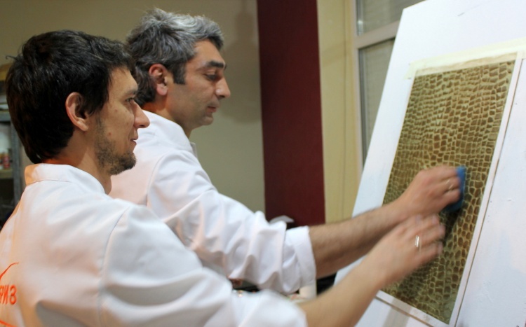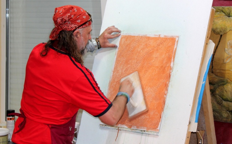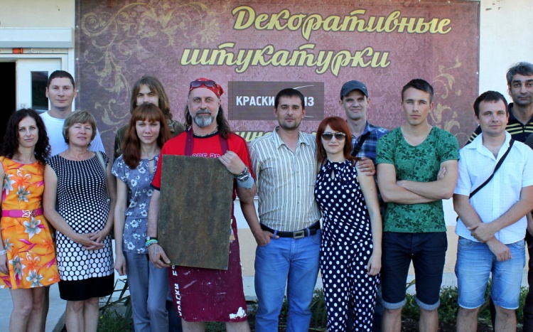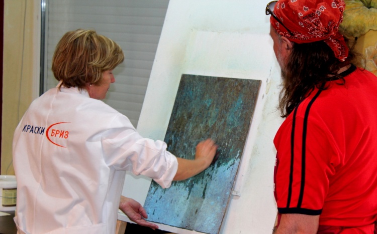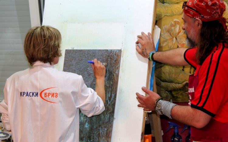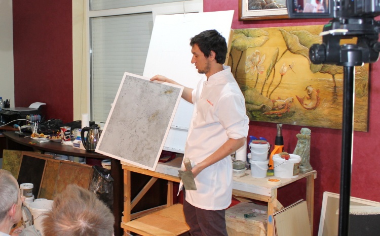 Владимир Кармиркодиян, генеральный директор компании, показал работу с декоративной штукатуркой «Белая глина», трафаретами и эмалями металлик, а также создал образец, имитирующий крокодиловую кожу, декоративной штукатуркой «Мелкий песок».