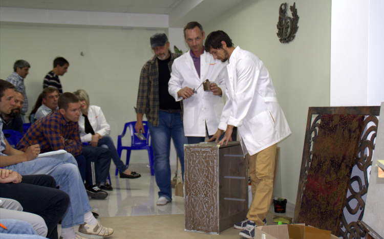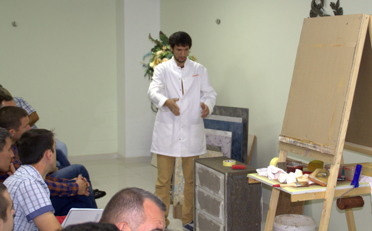 В продолжение темы декораторского искусства, наш мастер-класс мы посвятили презентации самых последних новинок компании, продемонстрировали техники работы с декоративными штукатурками и красками, поработали с трафаретами, создали винтажный комод.