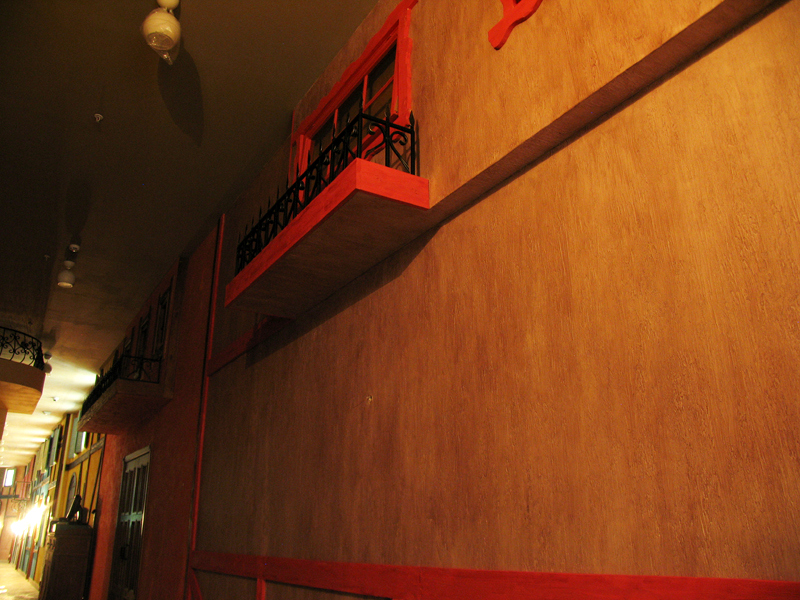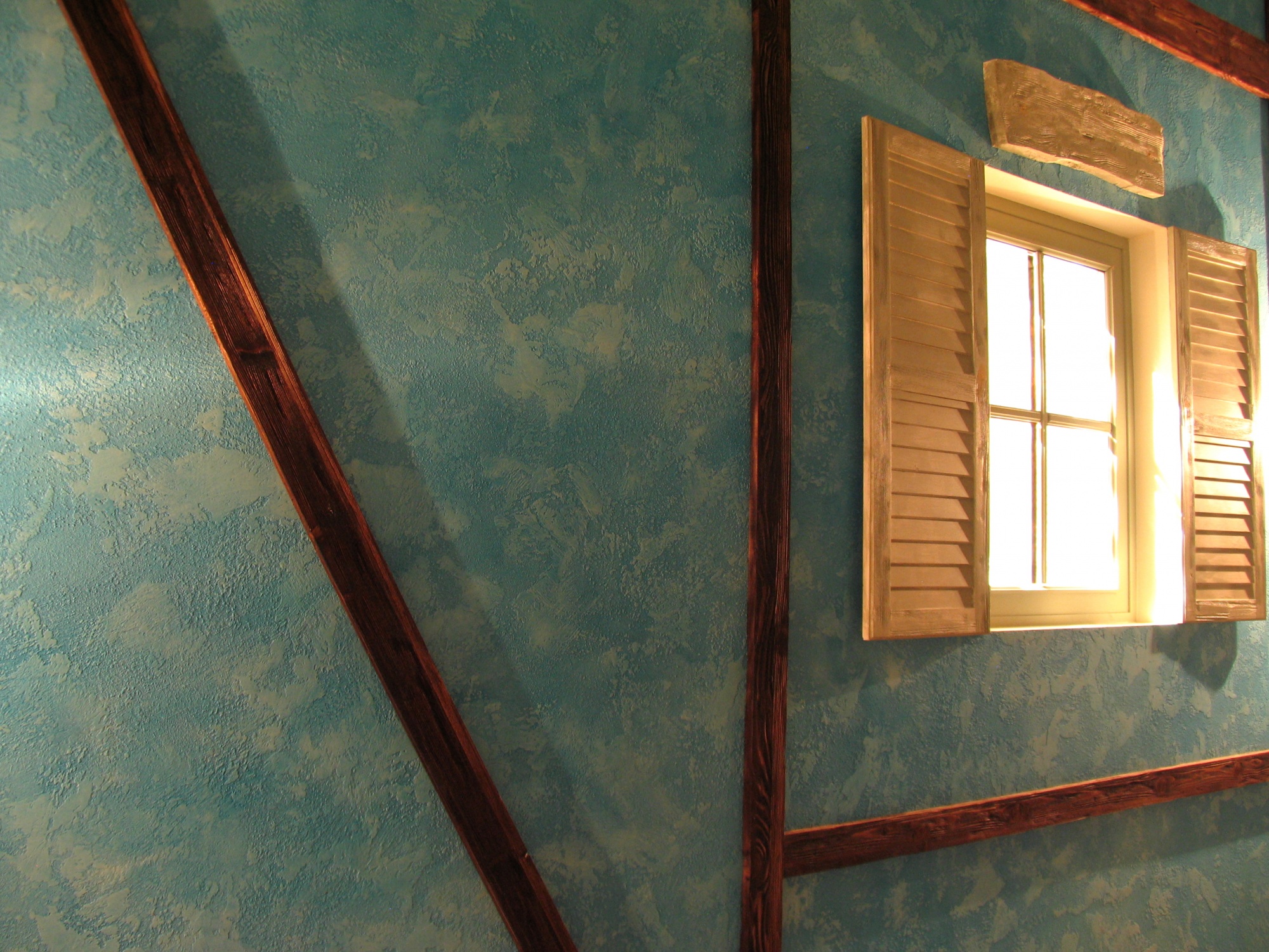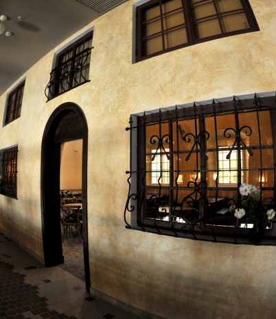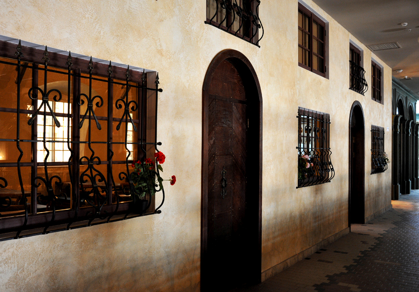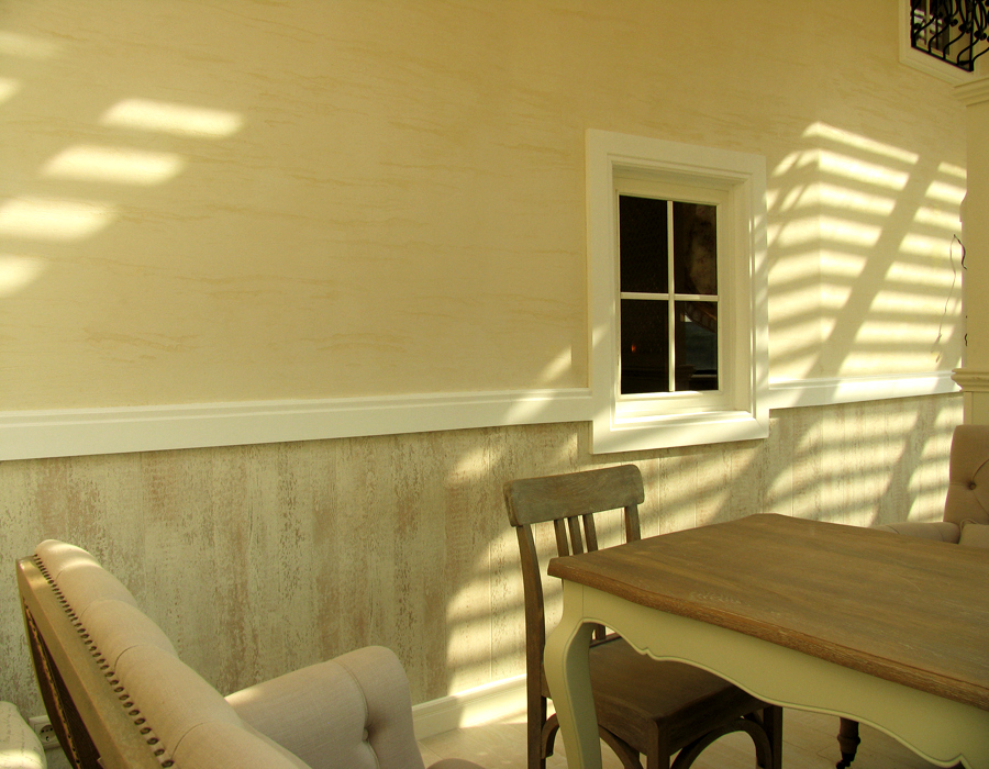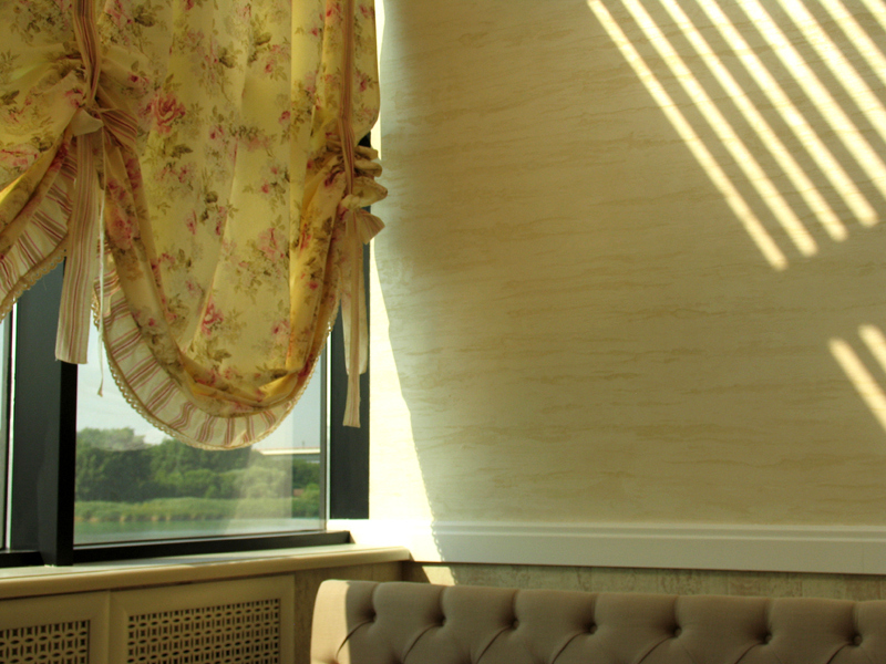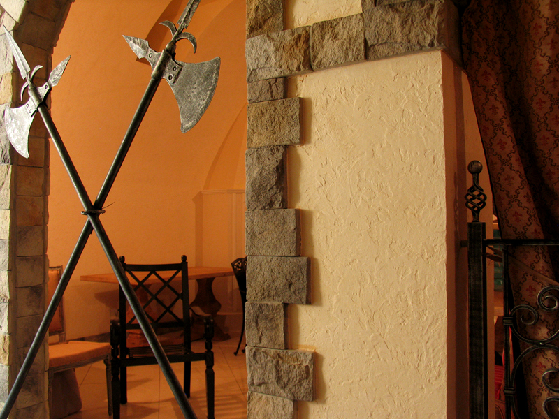 В отделке интерьера применена декоративная штукатурка, создающая различные стилизованные эффекты, задуманные архитектором: были использованы штукатурки «Белая глина», «Травертин», «Саман», а также применена система коррозии металлизированных красок собственной разработки «Каталана».