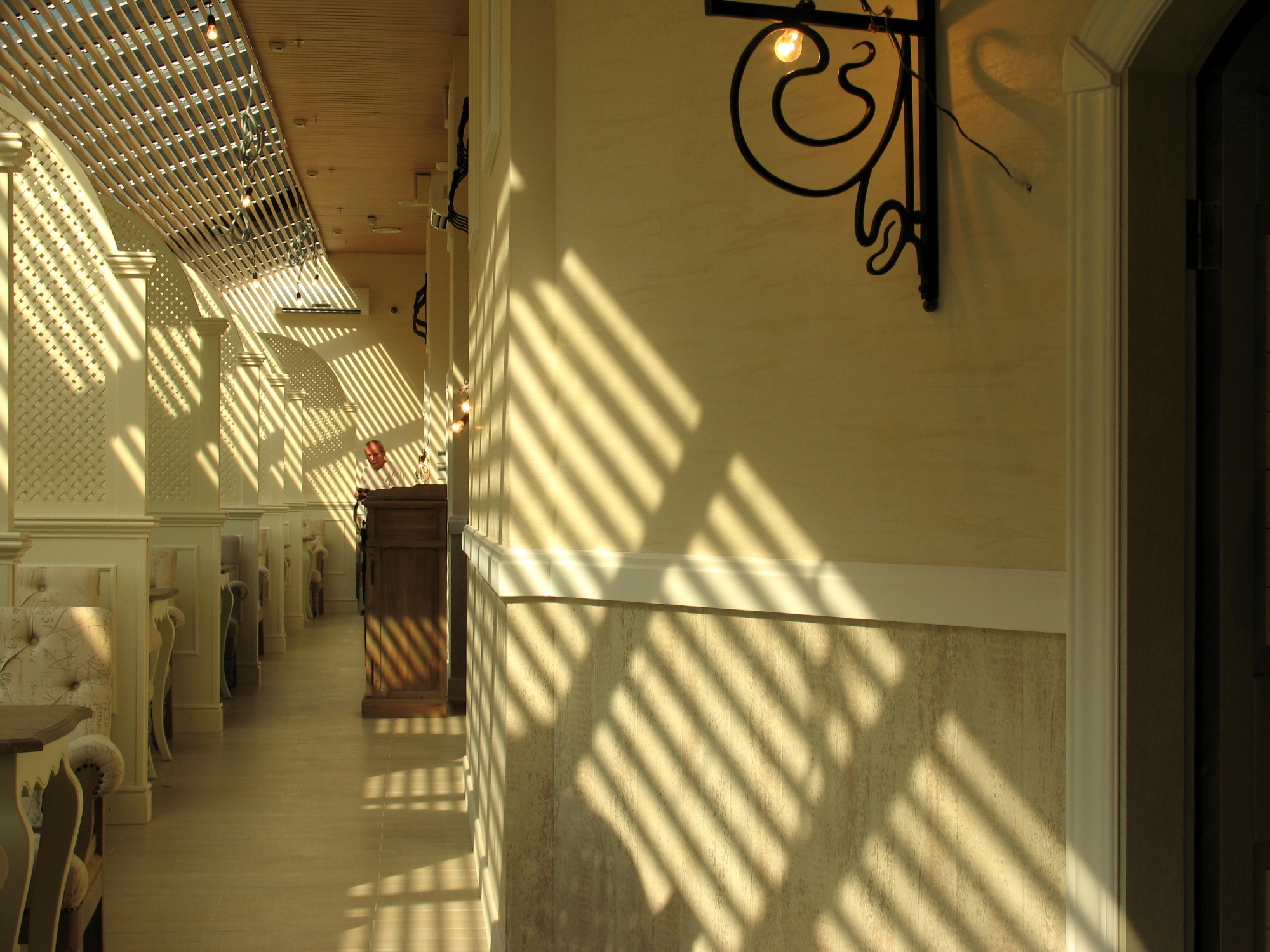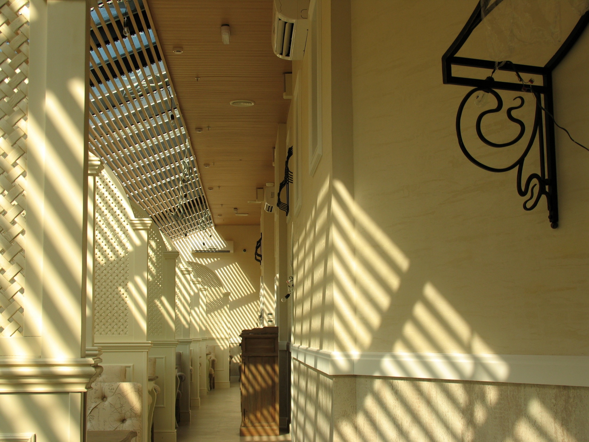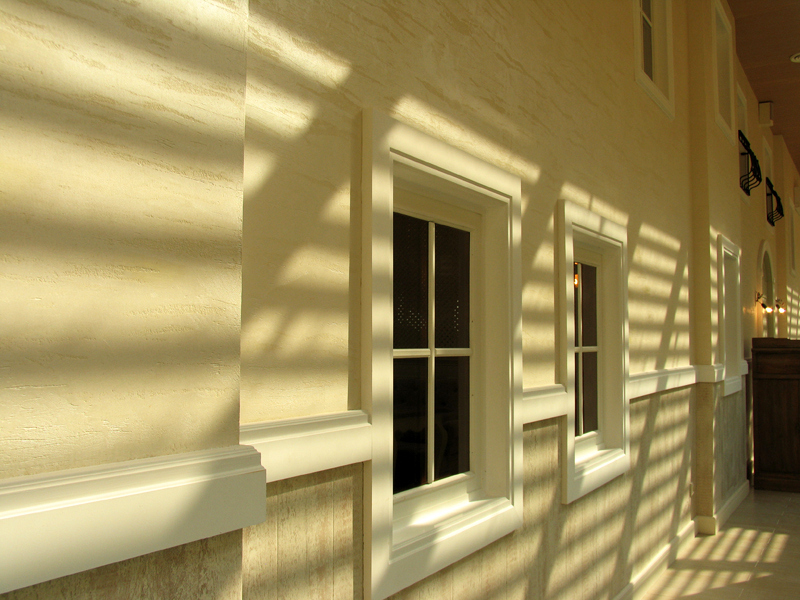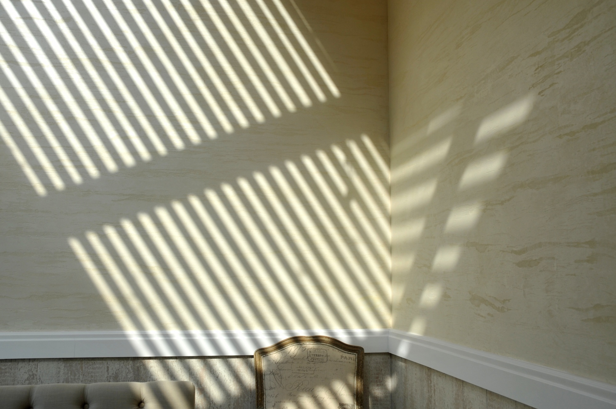 В отделке интерьера применена декоративная штукатурка, создающая различные стилизованные эффекты, задуманные архитектором: были использованы штукатурки «Белая глина», «Травертин», «Саман», а также применена система коррозии металлизированных красок собственной разработки «Каталана».