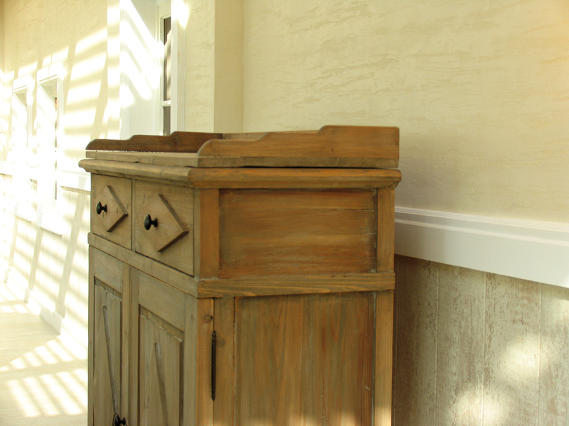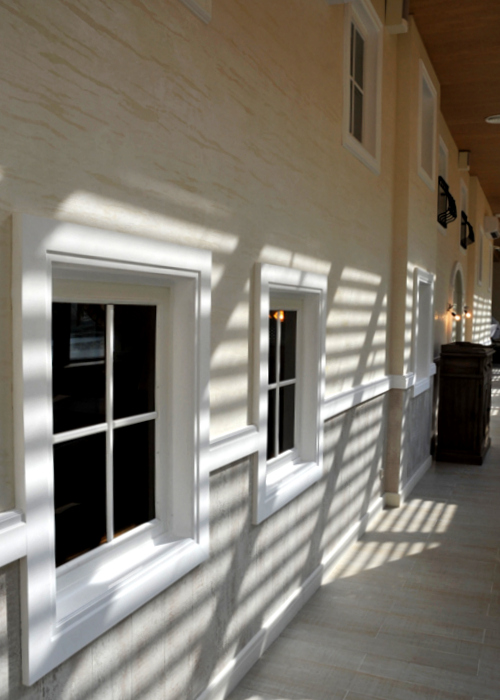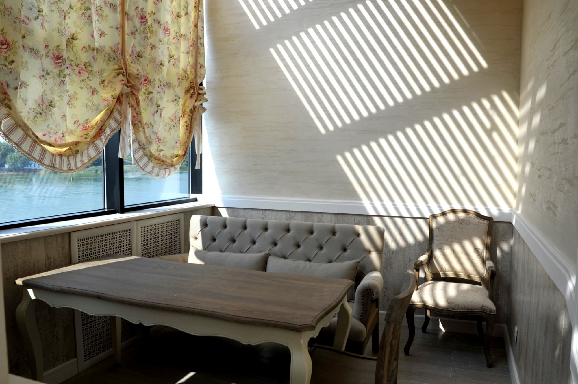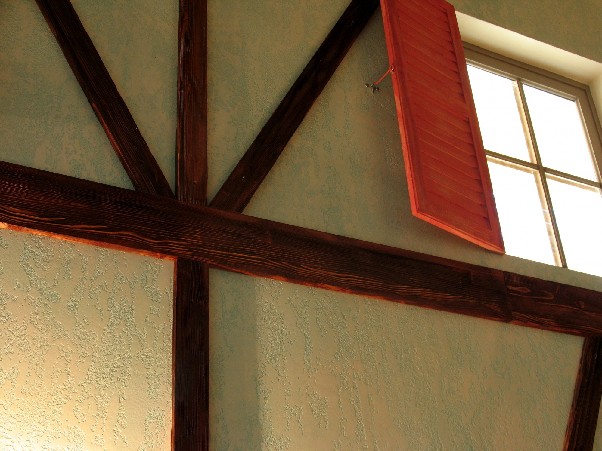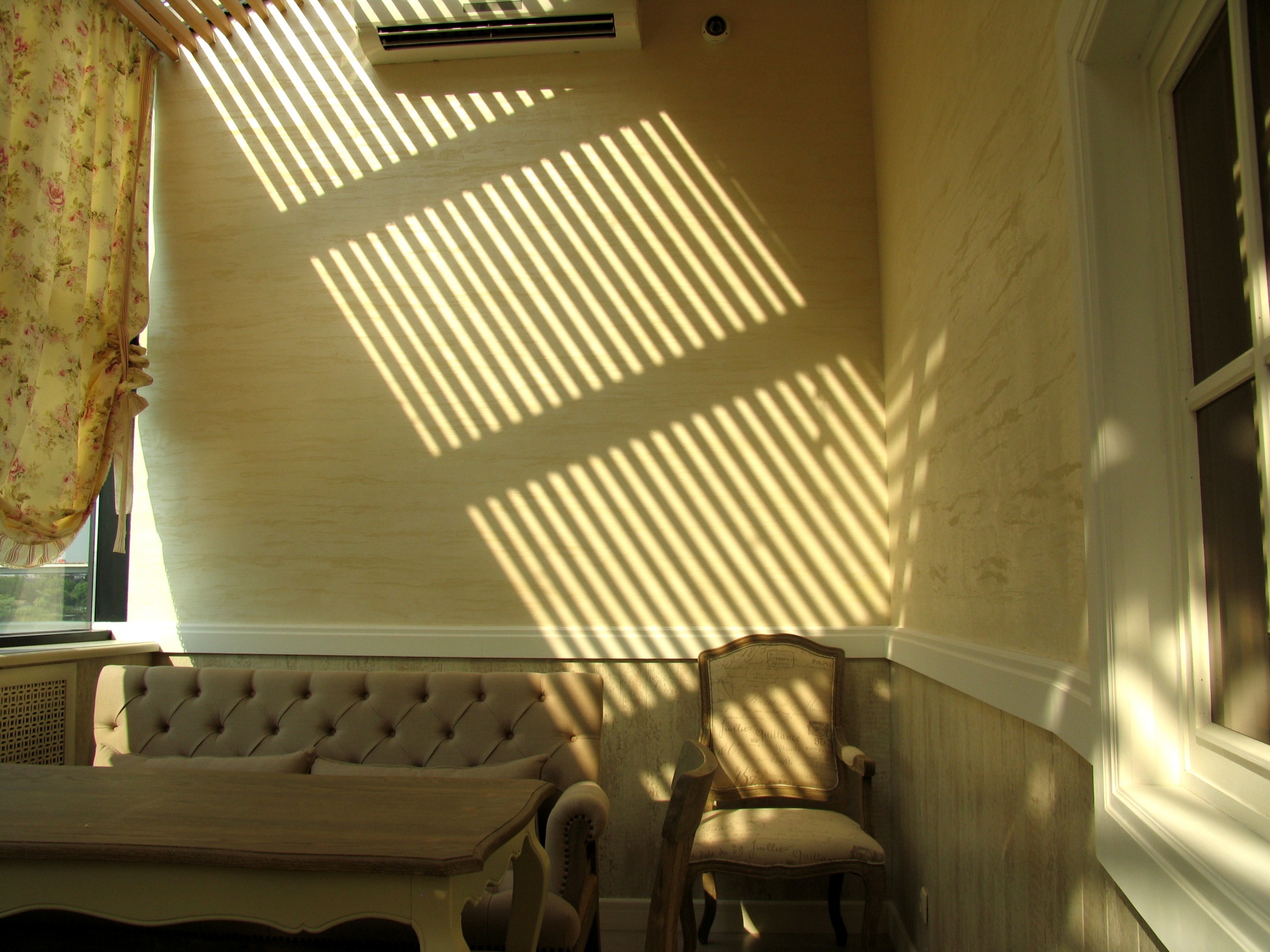 В отделке интерьера применена декоративная штукатурка, создающая различные стилизованные эффекты, задуманные архитектором: были использованы штукатурки «Белая глина», «Травертин», «Саман», а также применена система коррозии металлизированных красок собственной разработки «Каталана».
