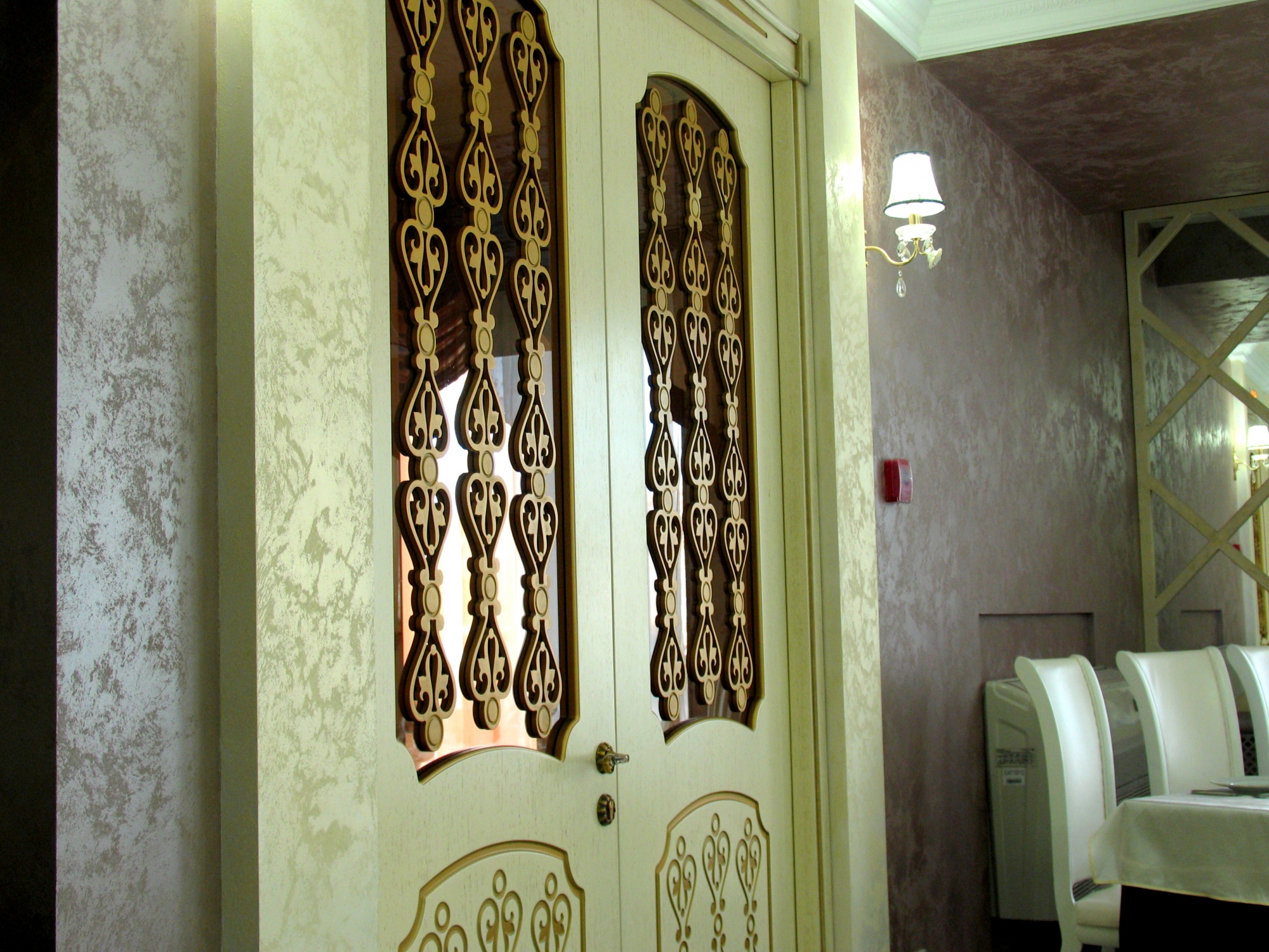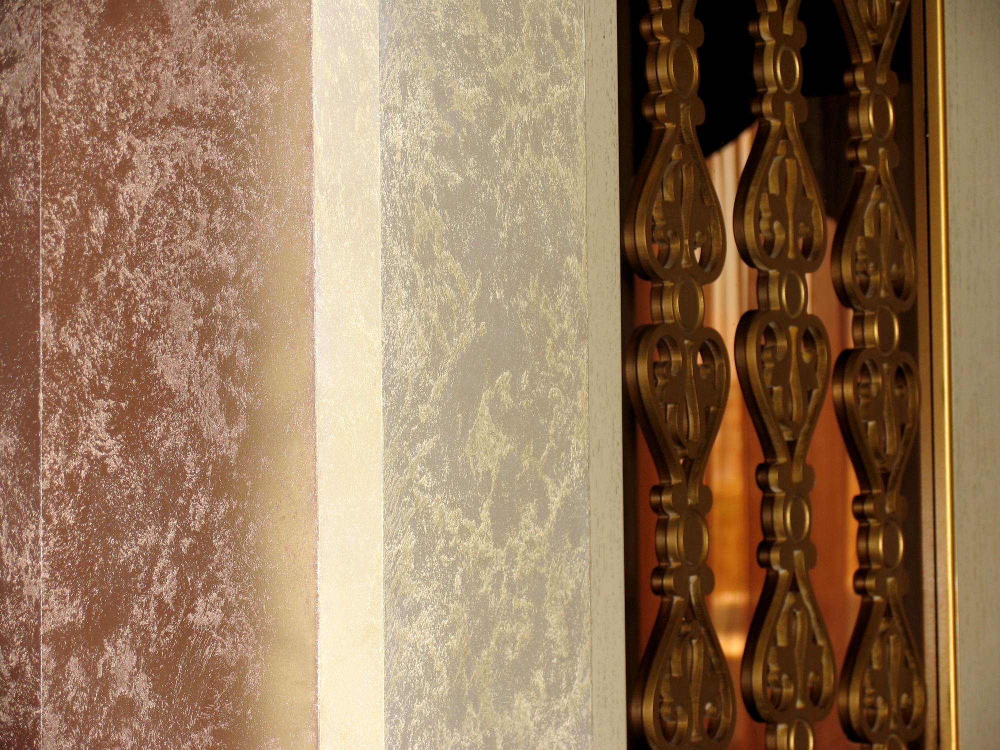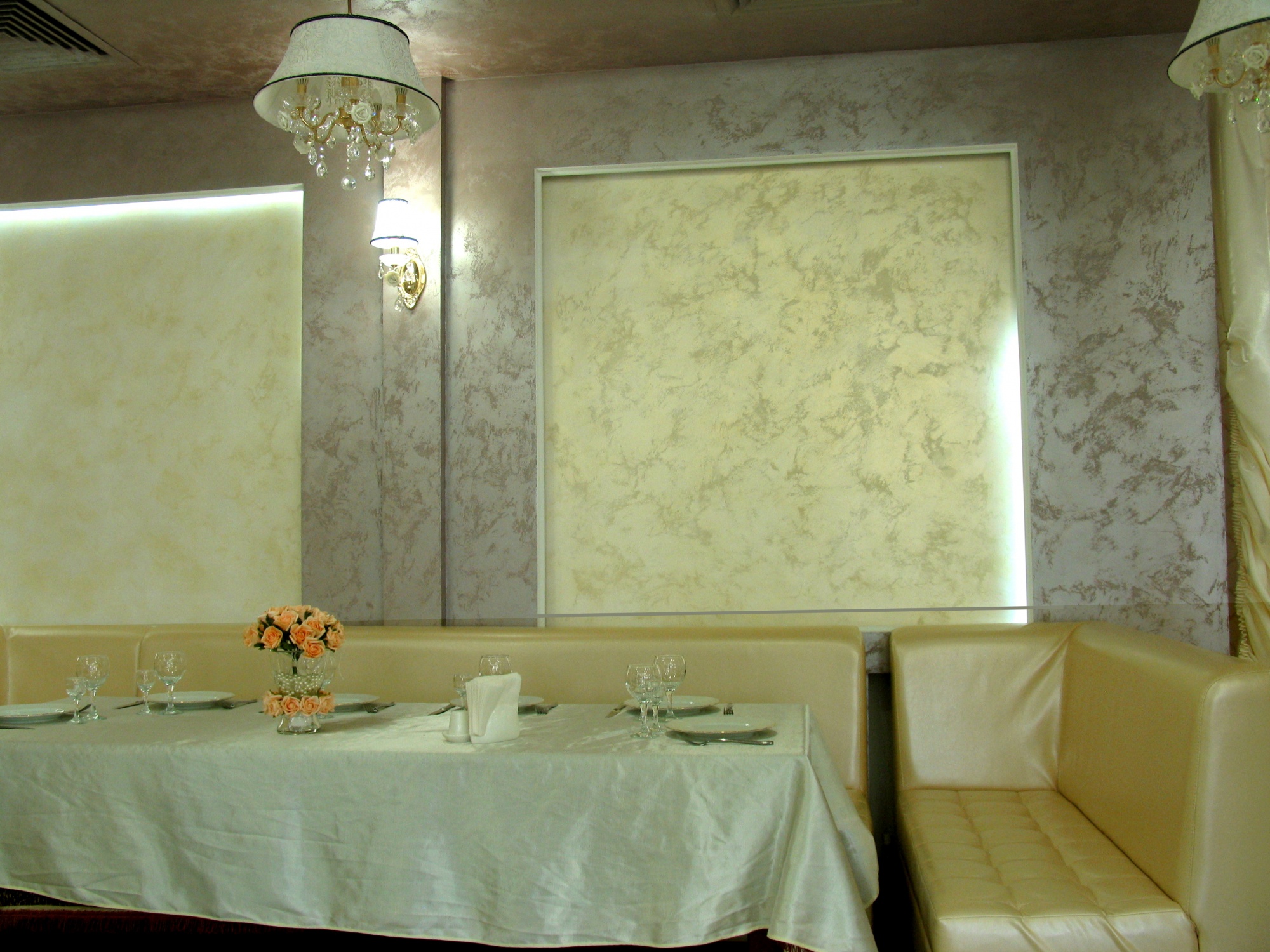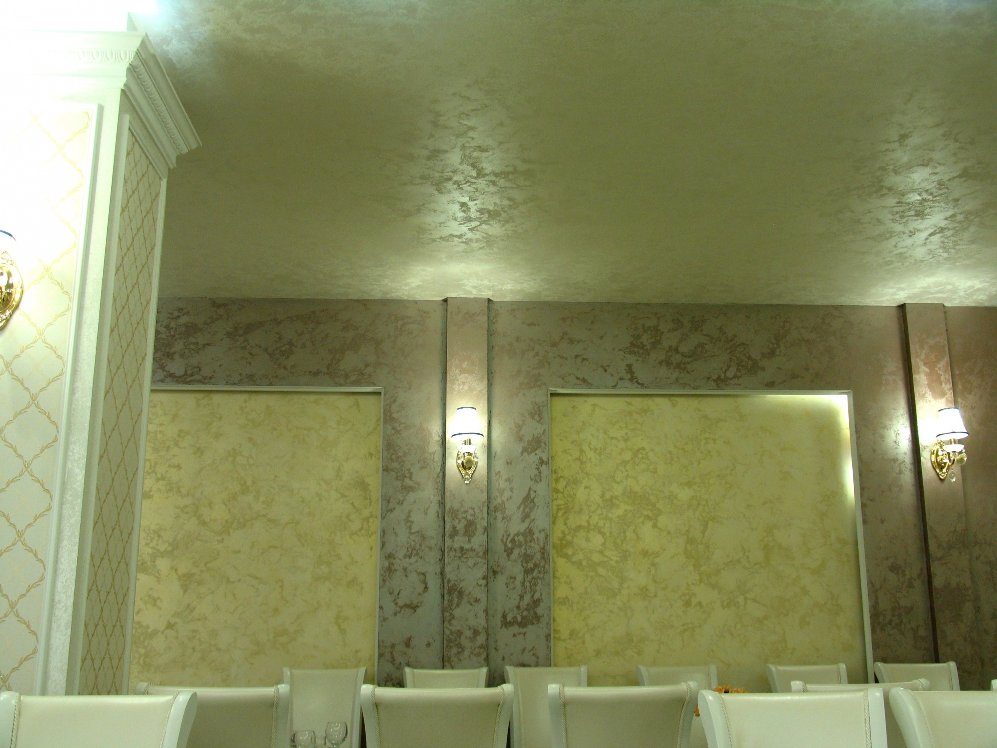 В отделке интерьера была применена декоративная краска «Бархан», заколерованная в различные оттенки.