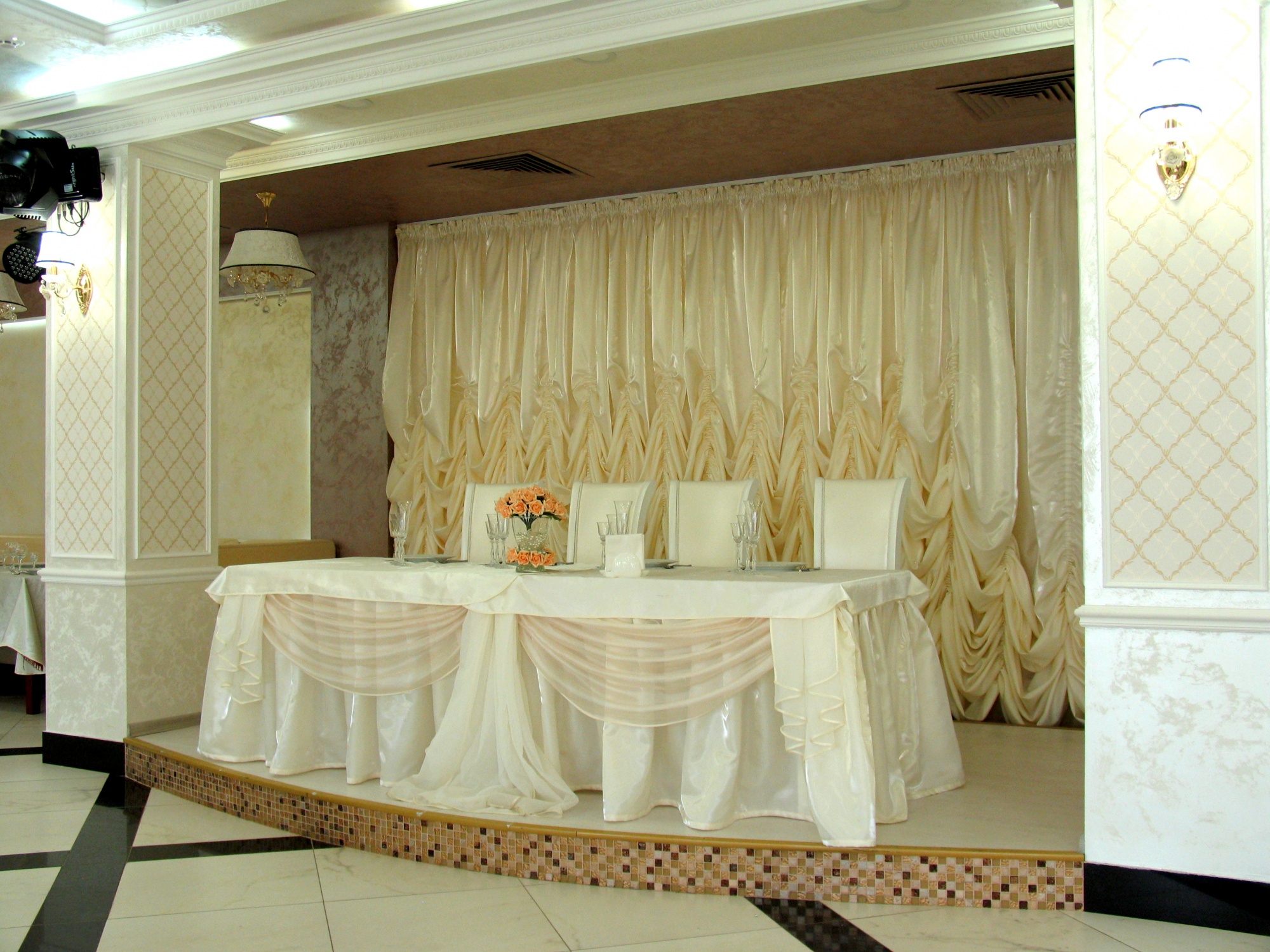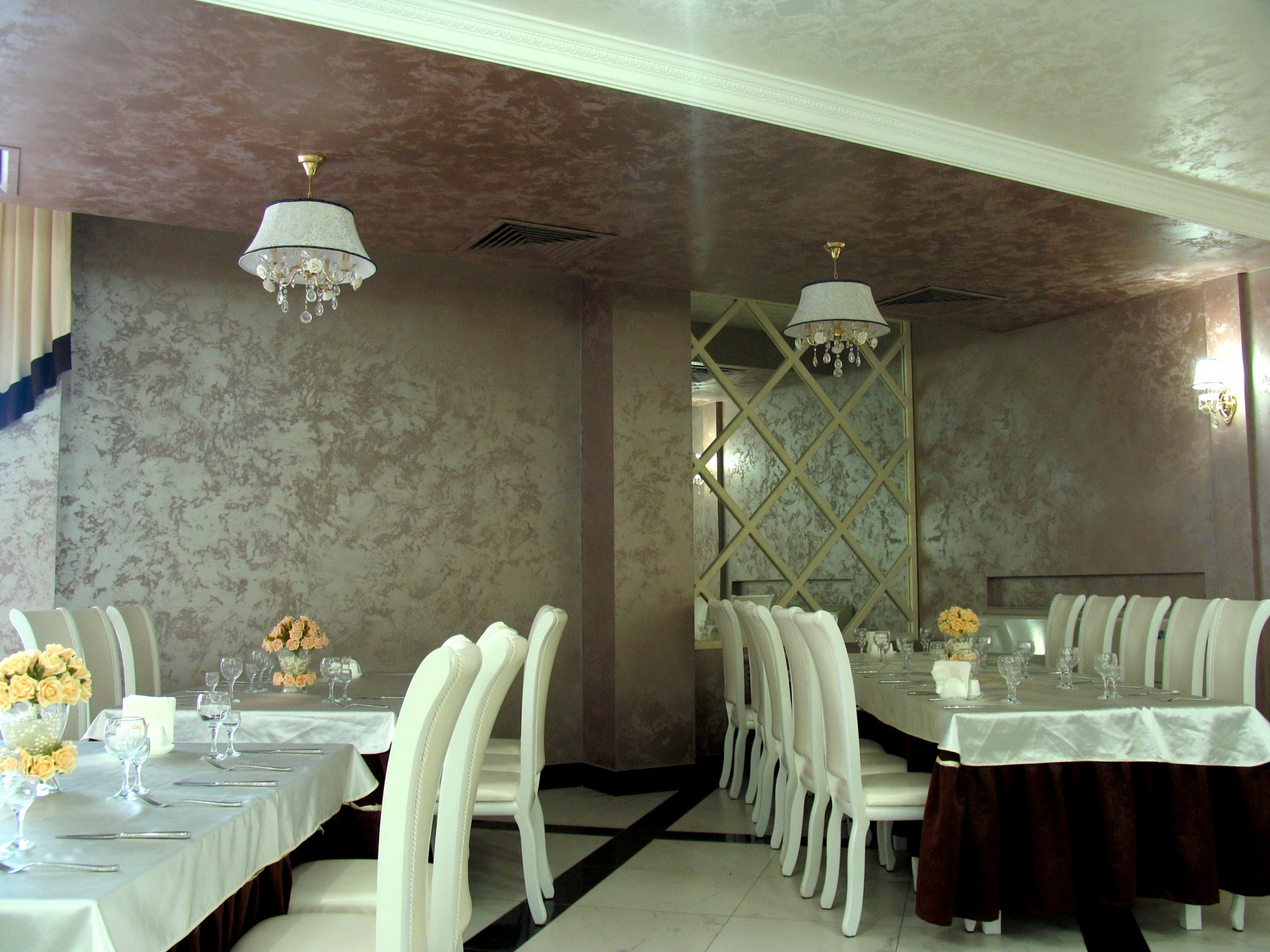 Благодаря своим декоративным свойствам, красивым переливам и приятной текстуре, интерьер получился очень нарядным, подходящим для любого торжества.
